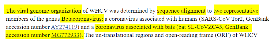 Die virale Genomorganisation von WHCV wurde durch Sequenzalignment mit zwei repräsentativen Mitgliedern der Gattung Betacoronavirus bestimmt: einem mit Menschen assoziierten Coronavirus (SARS-CoV Tor2, GenBank-Hinterlegungsnummer AY274119) und einem mit Fledermäusen assoziierten Coronavirus (Fledermaus SL-CoVZC45, GenBank-Hinterlegungsnummer MG772933).