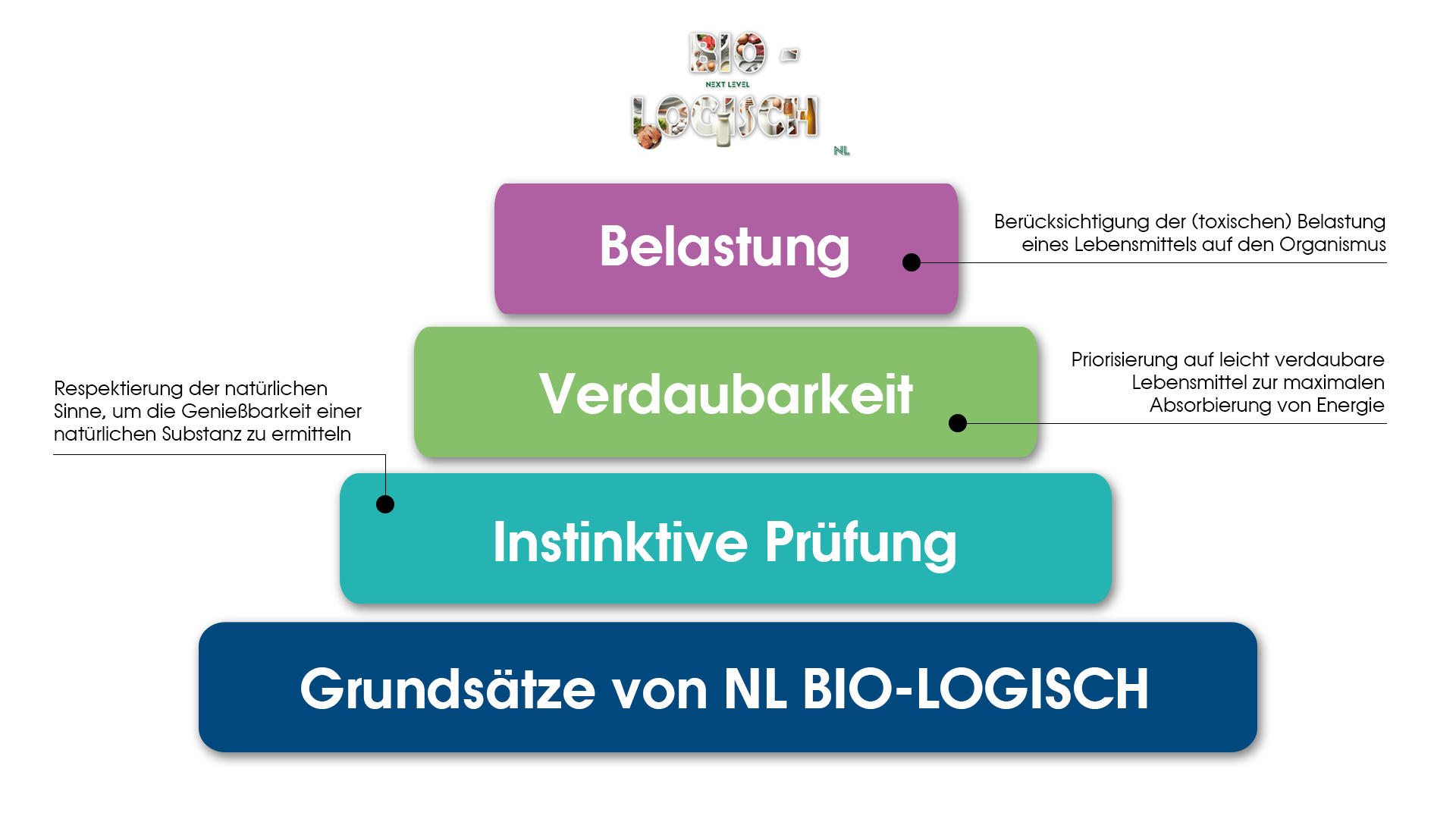 Anhand unserer NL BIO-LOGISCHEN Ernährungspyramide (siehe unten) kann sich orientiert werden. Unsere Ernährungspyramide visualisiert den Grad der Verdauungsfähigkeit (Mensch, roh) und die Belastung durch Nahrungsmittel auf biologischer Ebene.
