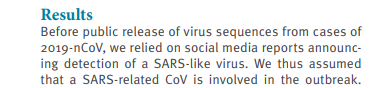 „Vor der Bekanntmache öffentlicher Virus-Sequenzen aus Fällen mit 2019-nCoV, haben wir uns auf Berichte aus den Sozialen Medien verlassen, in denen der Nachweis eines SARS-ähnlichen Virus angekündigt wurde. Deswegen haben wir angenommen, dass ein mit SARS in Verbindung stehendes CoV beim Ausbruch involviert ist.“