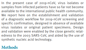 "Im vorliegenden Fall von 2019-nCoV sind Virusisolate oder Proben von infizierten Patienten der internationalen Gemeinschaft für das öffentliche Gesundheitswesen bisher nicht zugänglich. Wir berichten hier über die Einrichtung und Validierung eines diagnostischen Arbeitsablaufs für das 2019-nCoV-Screening und die spezifische Bestätigung, der in Ermangelung verfügbarer Virusisolate oder Original-Patientenproben entwickelt wurde. Design und Validierung wurden durch die enge genetische Verwandtschaft mit dem SARS-CoV von 2003 ermöglicht und durch den Einsatz der synthetischen Nukleinsäuretechnologie unterstützt."