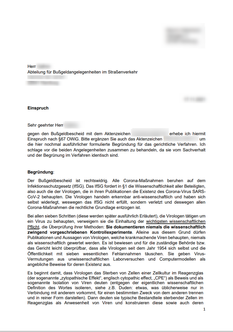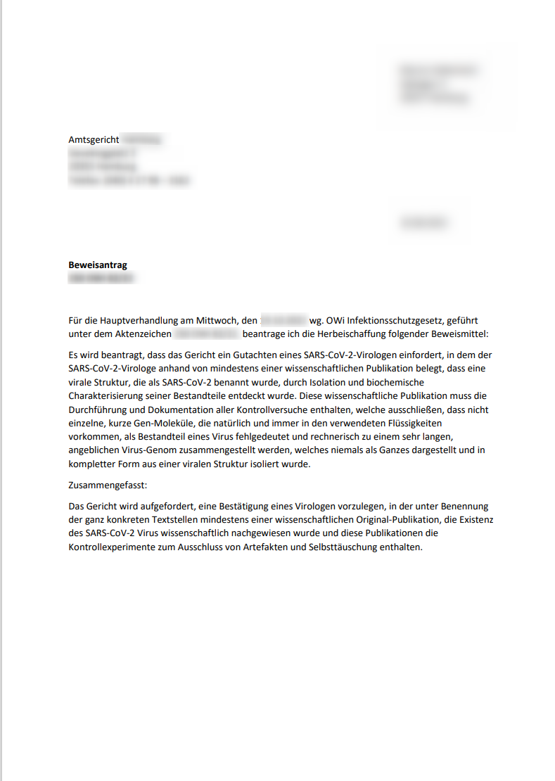 Wir nutzten diese Möglichkeit um die fehlende Wissenschaftlichkeit in der Virologie vor Gericht klären zu lassen, da der Paragraph 1 Infektionsschutzgesetz diese fordert. Dafür legten wir einen Einspruch ein und ergänzten um fünf Beweisanträge, mit denen wir auf die wissenschaftlich fundierte Grundlage gesetzt haben, mit denen deutlich wird, dass die Existenz des behaupteten SARS-CoV-2 zu keinem Zeitpunkt bewiesen wurde. Dies gilt für alle behaupteten krankmachenden Viren.