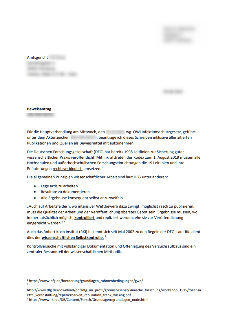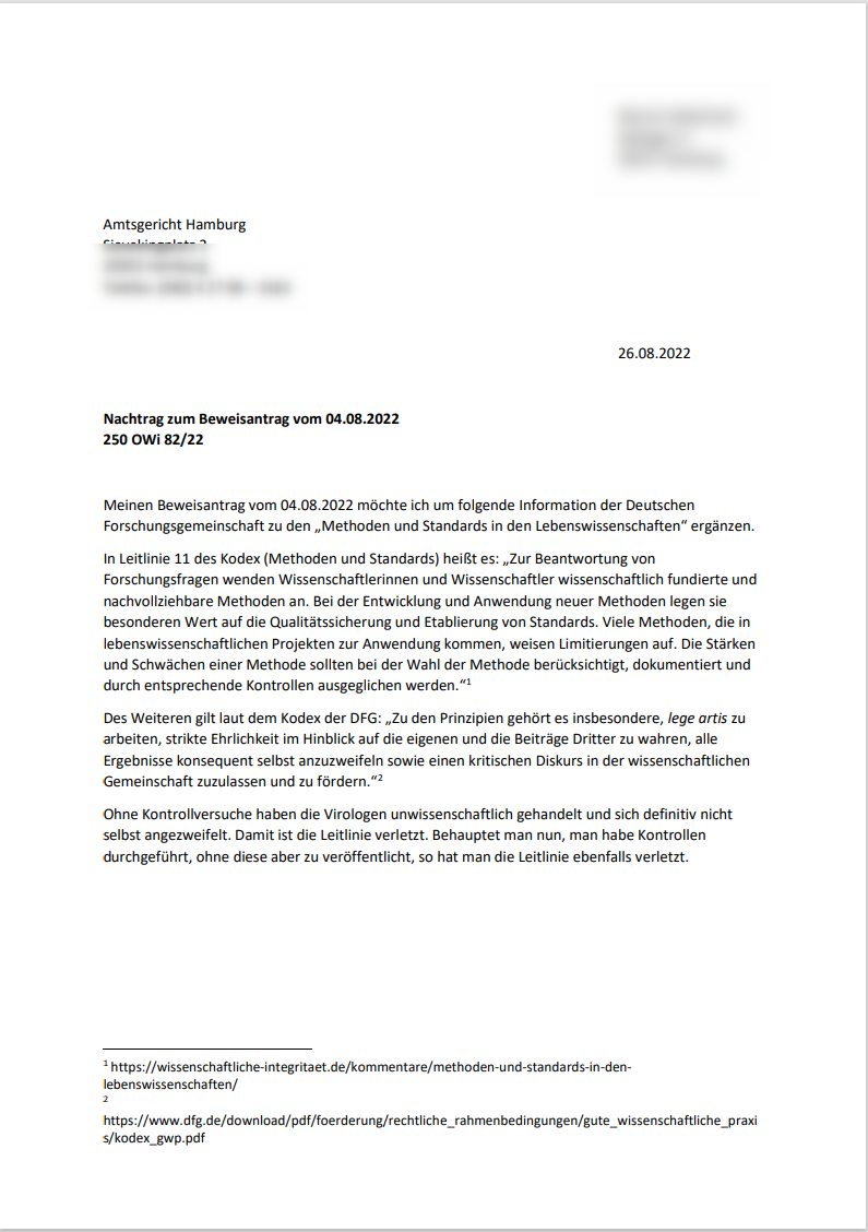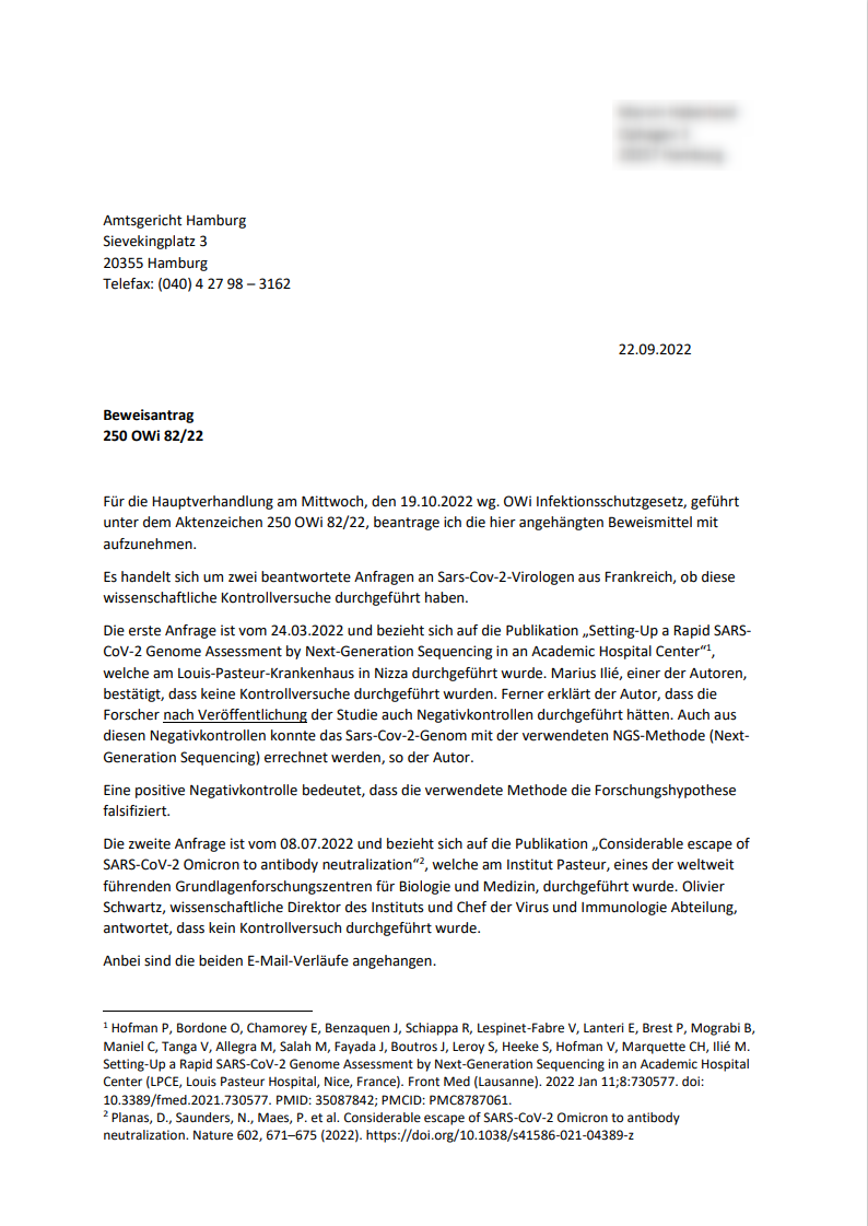 Für die Hauptverhandlung am xxx wg. OWi Infektionsschutzgesetz, geführt unter dem Aktenzeichen 250 OWi 82/22, beantrage ich die hier angehängten Beweismittel mit aufzunehmen. Es handelt sich um zwei beantwortete Anfragen an Sars-Cov-2-Virologen aus Frankreich, ob diese wissenschaftliche Kontrollversuche durchgeführt haben. Die erste Anfrage ist vom 24.03.2022 und bezieht sich auf die Publikation „Setting-Up a Rapid SARS-CoV-2 Genome Assessment by Next-Generation Sequencing in an Academic Hospital Center“ [1] , welche am Louis-Pasteur-Krankenhaus in Nizza durchgeführt wurde. Marius Ilié, einer der Autoren, bestätigt, dass keine Kontrollversuche durchgeführt wurden. Ferner erklärt der Autor, dass die Forscher nach Veröffentlichung der Studie auch Negativkontrollen durchgeführt hätten. Auch aus diesen Negativkontrollen konnte das Sars-Cov-2-Genom mit der verwendeten NGS-Methode (Next-Generation Sequencing) errechnet werden, so der Autor. Eine positive Negativkontrolle bedeutet, dass die verwendete Methode die Forschungshypothese falsifiziert. Die zweite Anfrage ist vom 08.07.2022 und bezieht sich auf die Publikation „Considerable escape of SARS-CoV-2 Omicron to antibody neutralization“ [2] , welche am Institut Pasteur, eines der weltweit führenden Grundlagenforschungszentren für Biologie und Medizin, durchgeführt wurde. Olivier Schwartz, wissenschaftliche Direktor des Instituts und Chef der Virus und Immunologie Abteilung, antwortet, dass kein Kontrollversuch durchgeführt wurde. Anbei sind die beiden E-Mail-Verläufe angehangen.