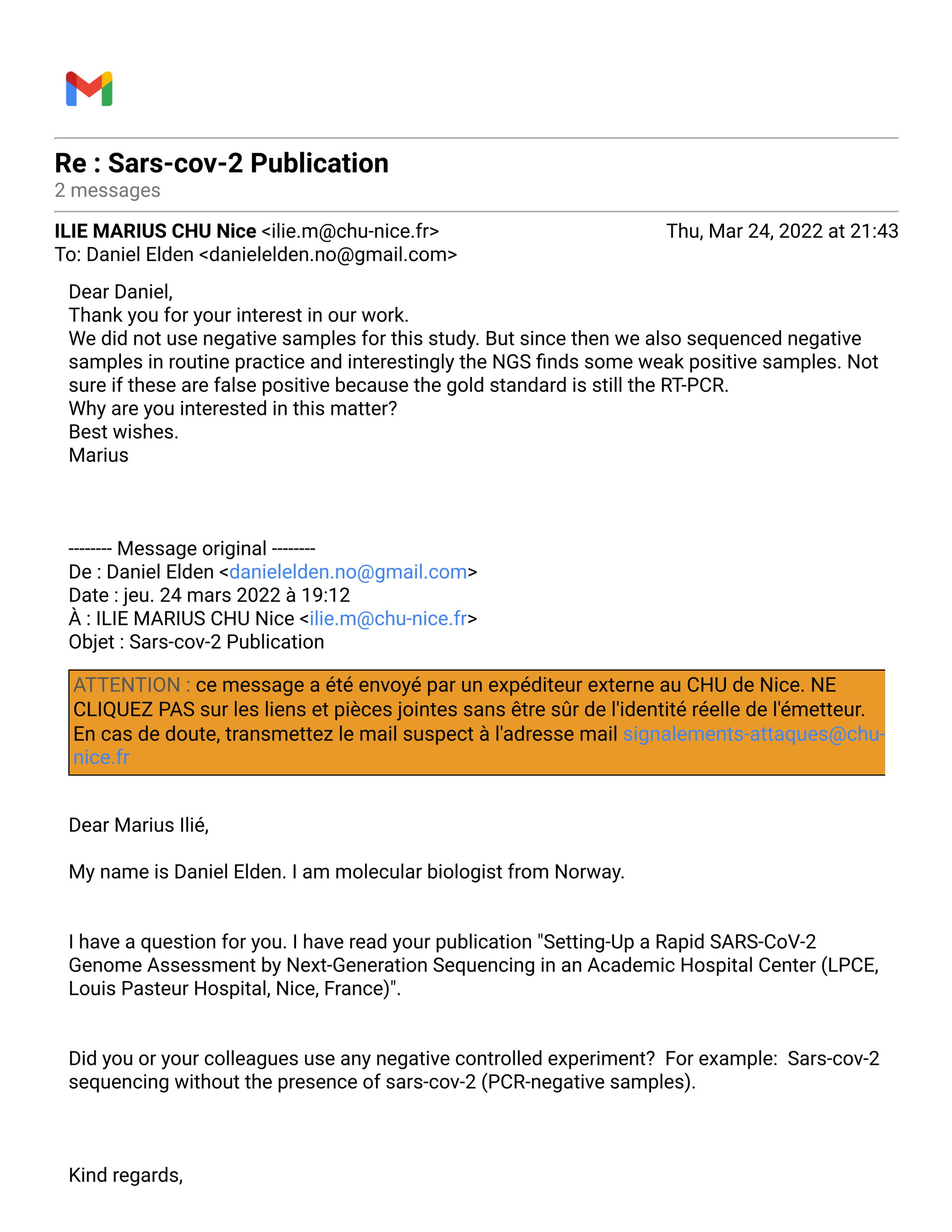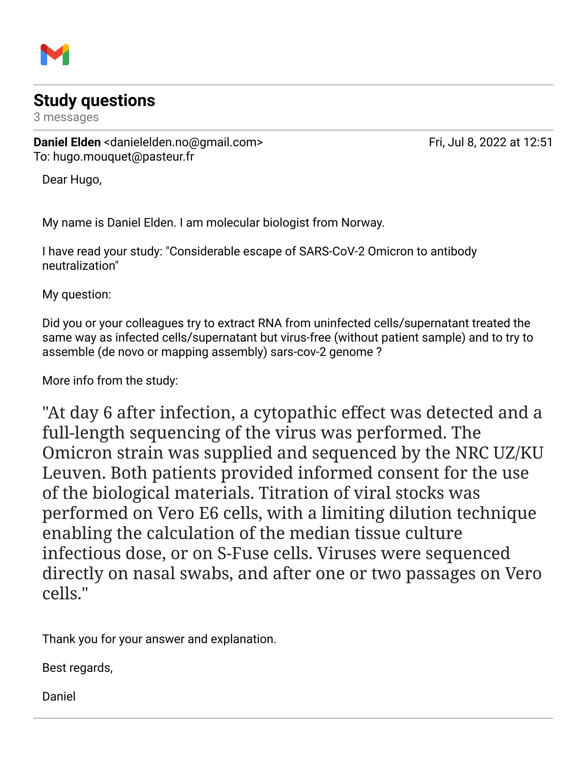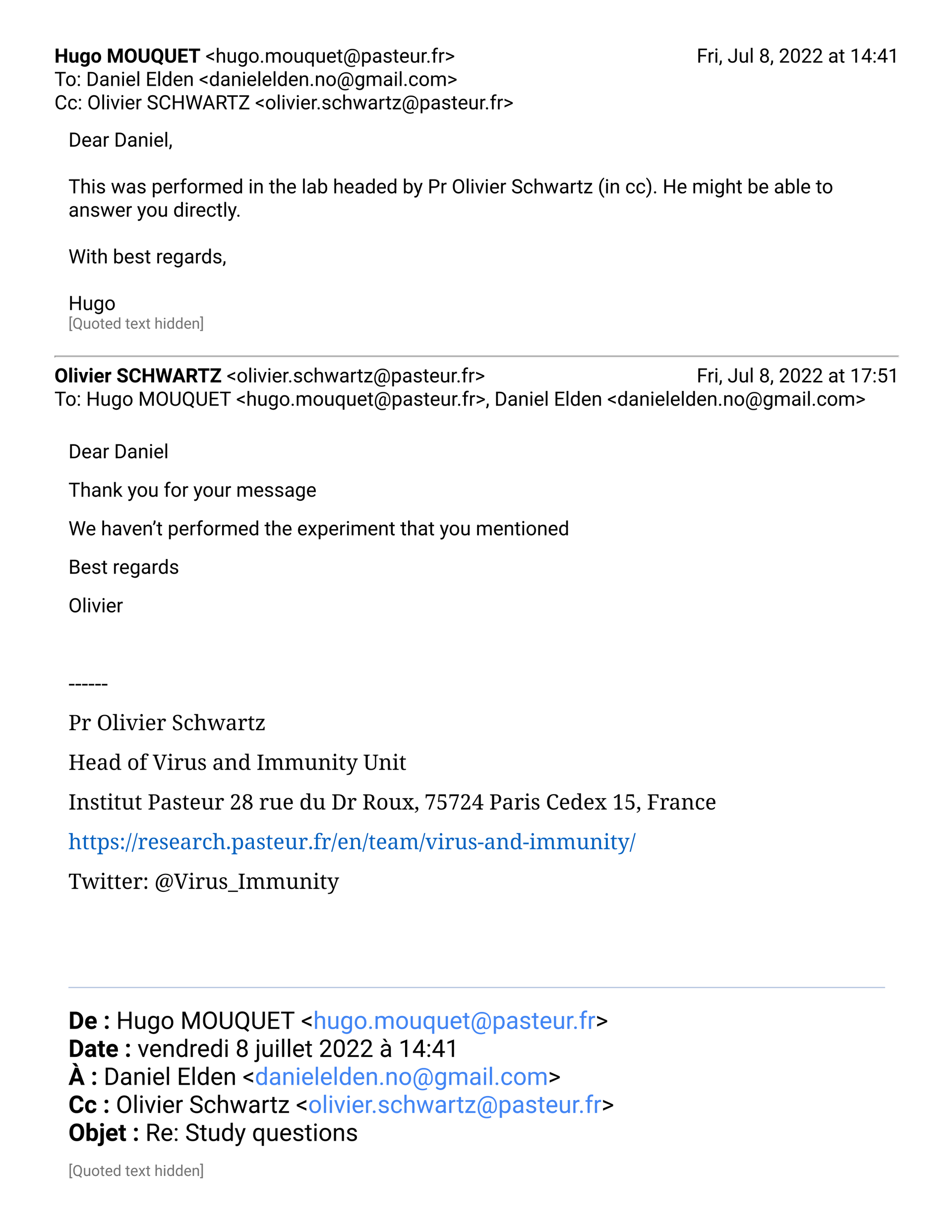 Für die Hauptverhandlung am xxx wg. OWi Infektionsschutzgesetz, geführt unter dem Aktenzeichen 250 OWi 82/22, beantrage ich die hier angehängten Beweismittel mit aufzunehmen. Es handelt sich um zwei beantwortete Anfragen an Sars-Cov-2-Virologen aus Frankreich, ob diese wissenschaftliche Kontrollversuche durchgeführt haben. Die erste Anfrage ist vom 24.03.2022 und bezieht sich auf die Publikation „Setting-Up a Rapid SARS-CoV-2 Genome Assessment by Next-Generation Sequencing in an Academic Hospital Center“ [1] , welche am Louis-Pasteur-Krankenhaus in Nizza durchgeführt wurde. Marius Ilié, einer der Autoren, bestätigt, dass keine Kontrollversuche durchgeführt wurden. Ferner erklärt der Autor, dass die Forscher nach Veröffentlichung der Studie auch Negativkontrollen durchgeführt hätten. Auch aus diesen Negativkontrollen konnte das Sars-Cov-2-Genom mit der verwendeten NGS-Methode (Next-Generation Sequencing) errechnet werden, so der Autor. Eine positive Negativkontrolle bedeutet, dass die verwendete Methode die Forschungshypothese falsifiziert. Die zweite Anfrage ist vom 08.07.2022 und bezieht sich auf die Publikation „Considerable escape of SARS-CoV-2 Omicron to antibody neutralization“ [2] , welche am Institut Pasteur, eines der weltweit führenden Grundlagenforschungszentren für Biologie und Medizin, durchgeführt wurde. Olivier Schwartz, wissenschaftliche Direktor des Instituts und Chef der Virus und Immunologie Abteilung, antwortet, dass kein Kontrollversuch durchgeführt wurde. Anbei sind die beiden E-Mail-Verläufe angehangen.