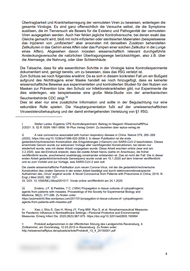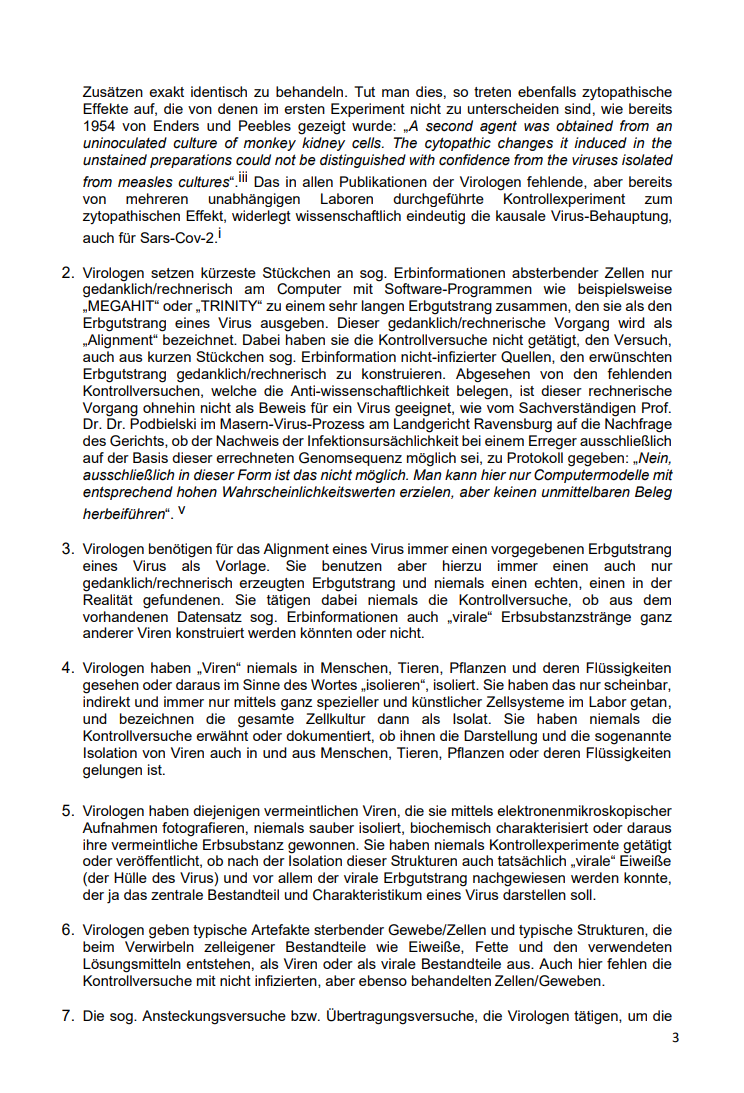 Für den Beklagten reicht es aus, die Widerlegungen, die Verletzung der Wissenschaftlichkeit, der Denk-Gesetze und der Logik bei der Behauptung des SARS-CoV-2-Virus vorgebracht zu haben.