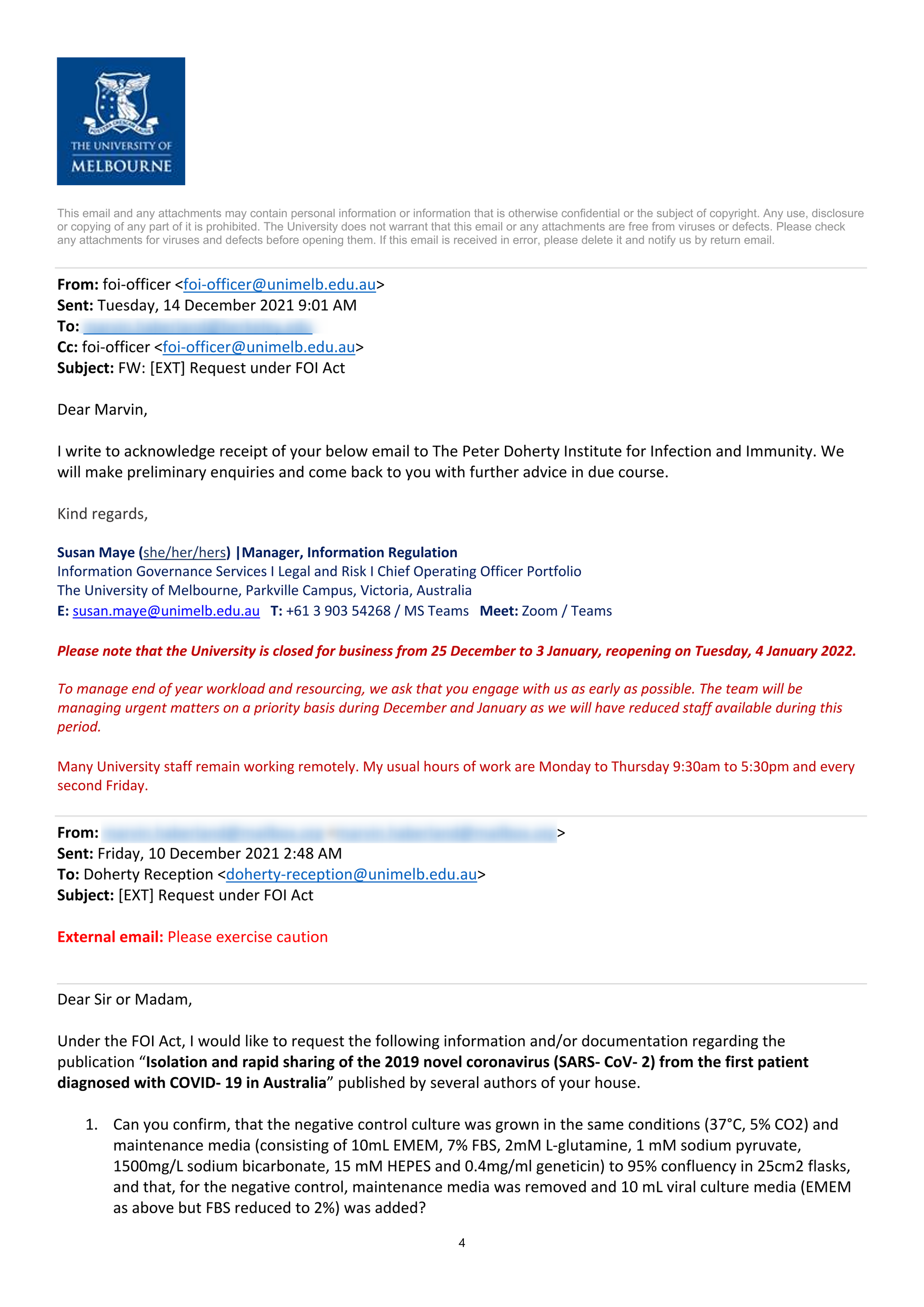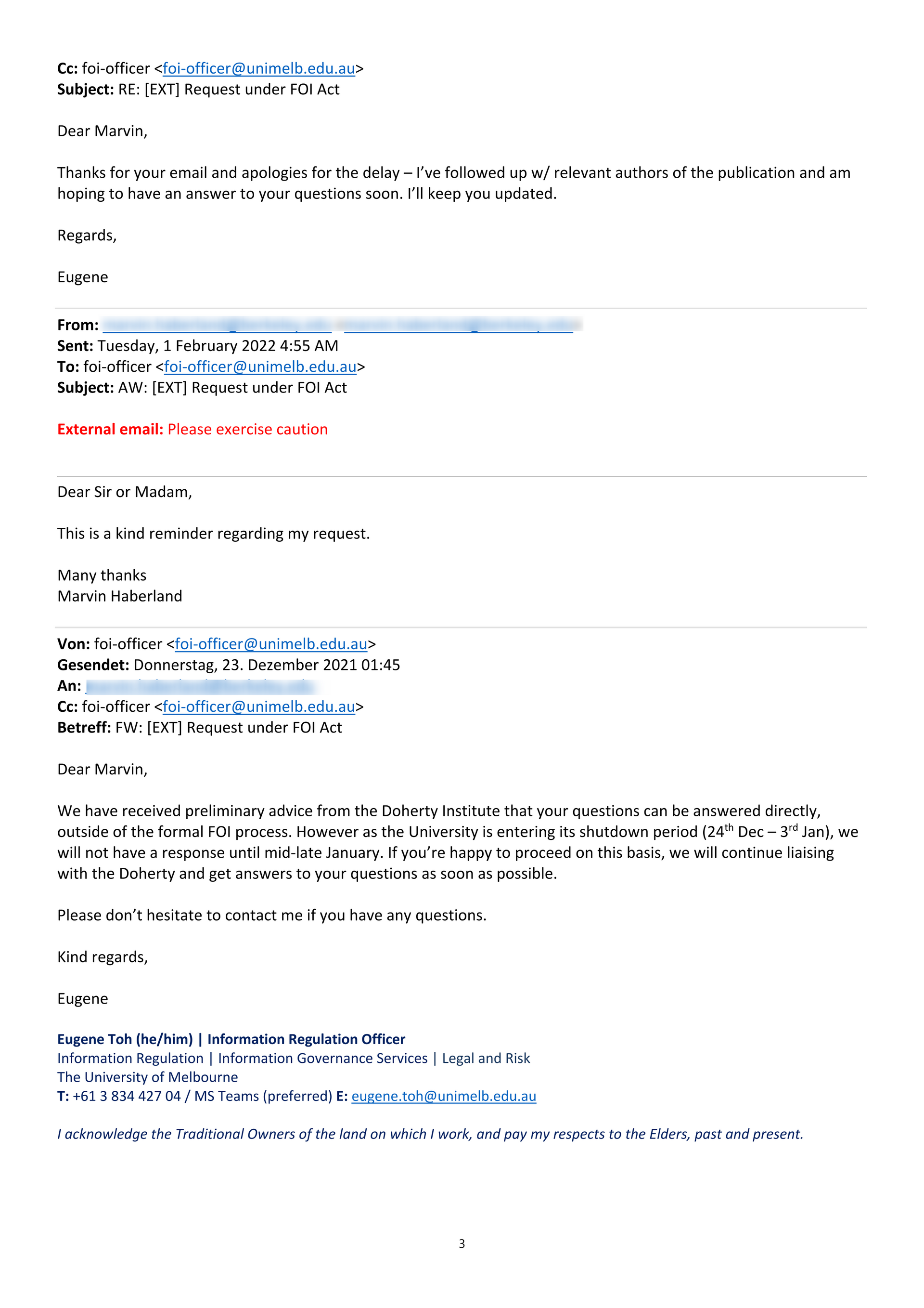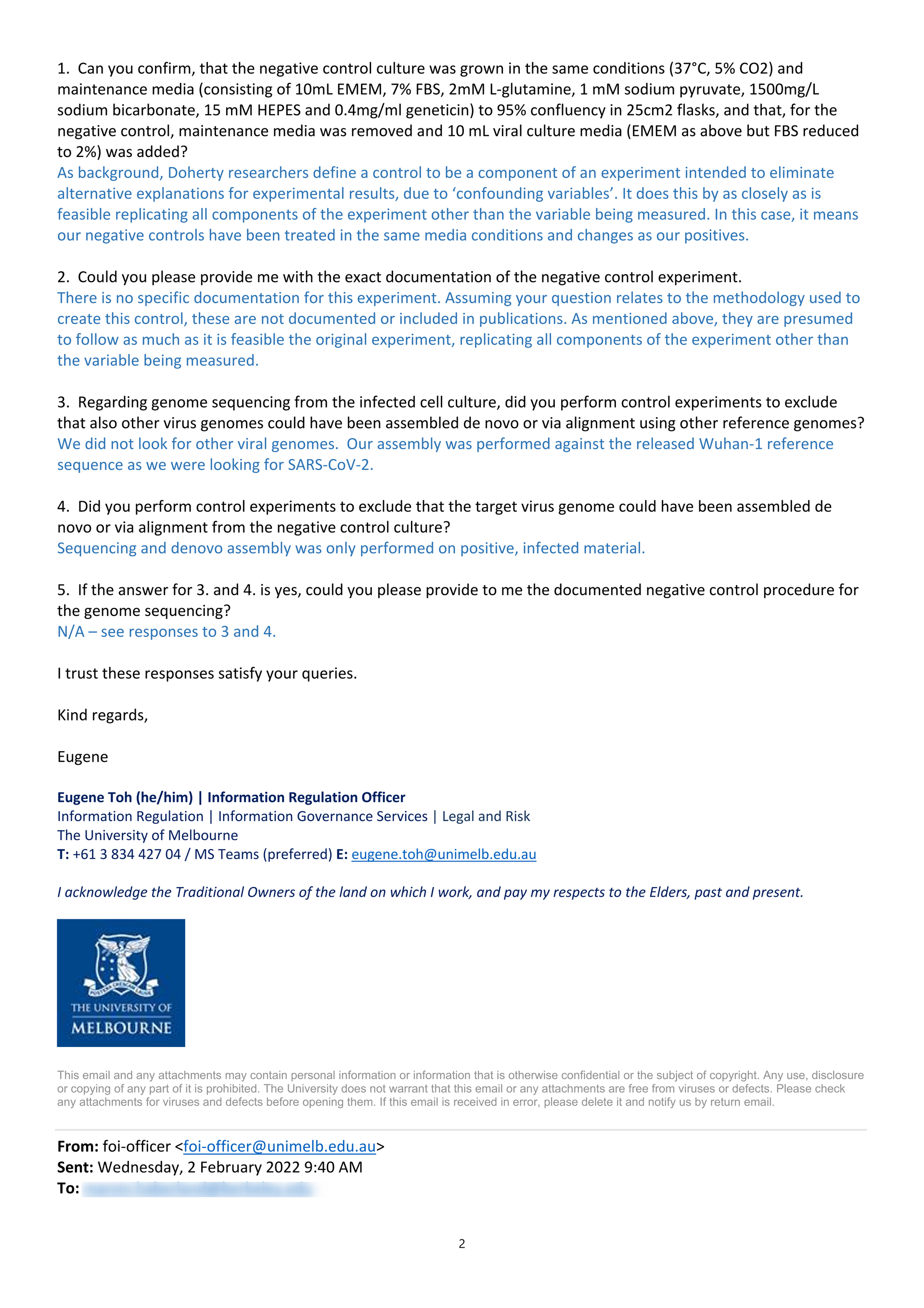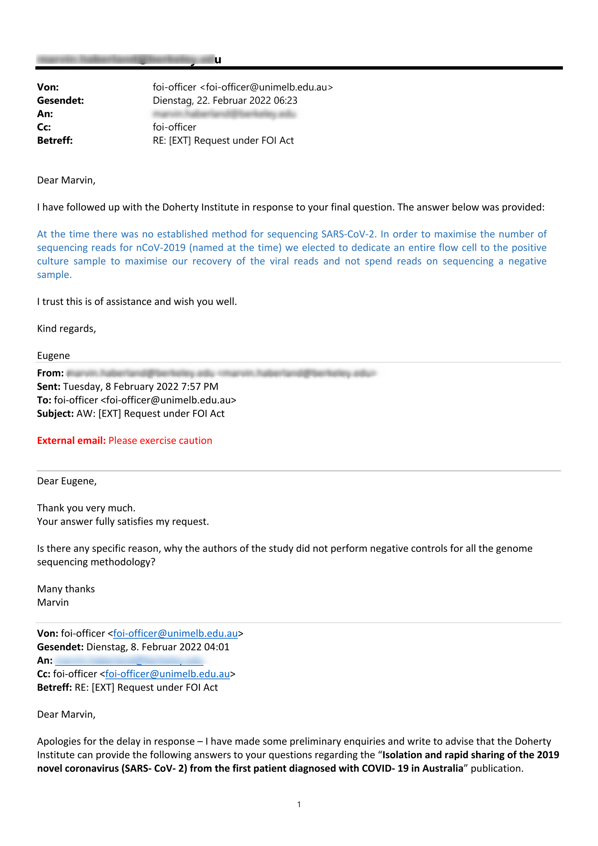 Es handelt sich um eine beantwortete Anfrage nach dem Informationsfreiheitsgesetz (Freedom of Information Act, FOIA) durch das australische Peter-Doherty-Institute-for-Infection-and- Immunity an der Universität von Melbourne.
