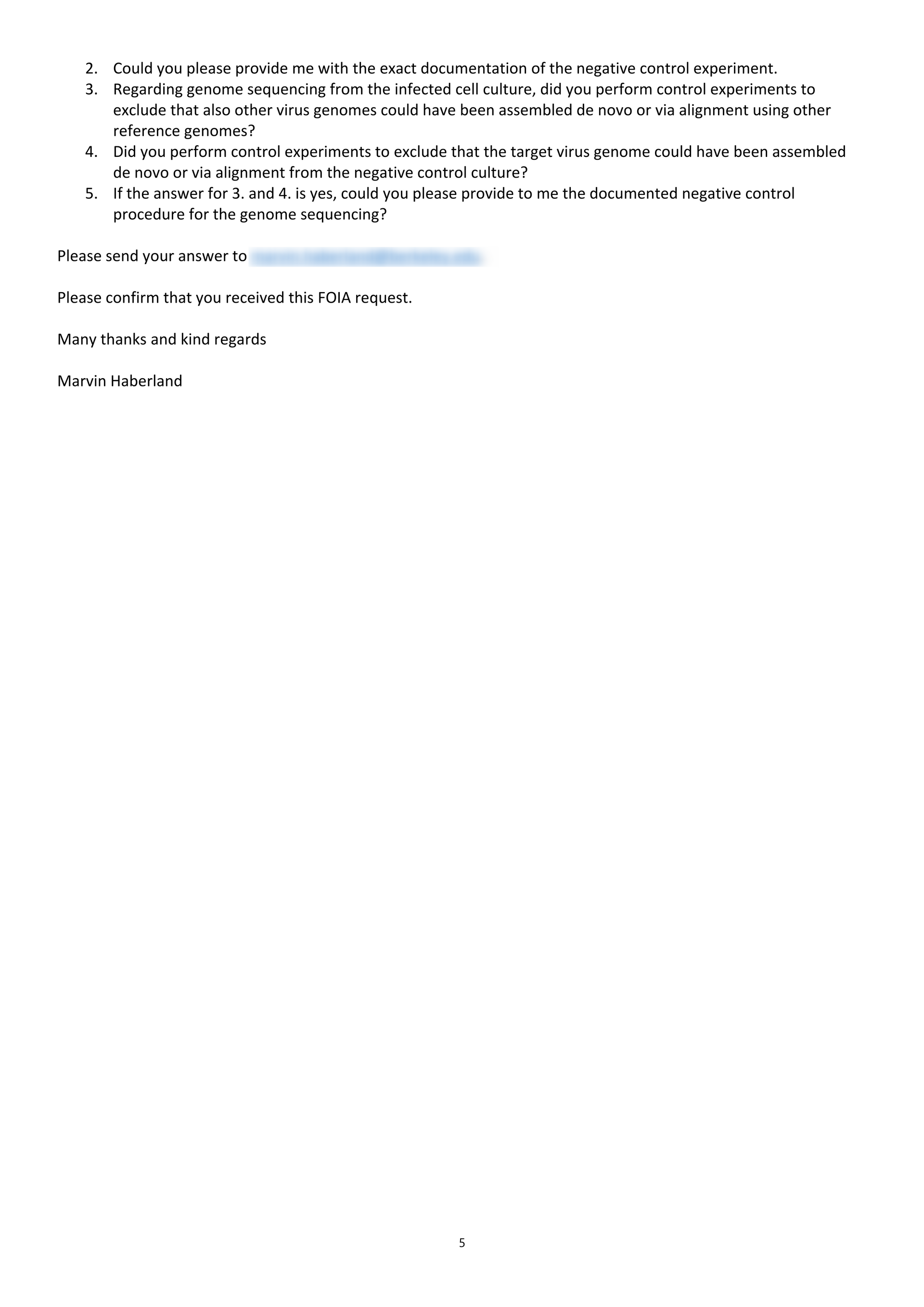[ich /jemand] fragte bei den Autoren der Studie nach, ob diese die wissenschaftlich vorgeschriebenen Kontrollversuche für ihre Methoden durchgeführt und dokumentiert haben. Laut der Autoren wurden in der gesamten Publikation keine Kontrollversuche dokumentiert, und für die gesamte Genomsequenzierung auch nicht durchgeführt. Damit ist ein zentraler Bestandteil der wissenschaftlichen Methode verletzt. Die Publikation aus Australien ist kein Einzelfall. Keine der publizierten Studien zum sogenannten Erregernachweis (bzw. der Isolierung) für „Sars-CoV-2“ beinhaltet durchgeführte und dokumentierte Kontrollversuche für die verwendeten Methoden (inklusive der Genomsequenzierung). Für die Hauptverhandlung fordere ich das Gericht auf, dies zu prüfen. Die entsprechend durchzuführenden Kontrollversuche habe ich in der Begründung meines Einspruches bereits detailliert beschrieben. Nachfolgend ist das entsprechende Schriftstück der FOIA-Anfrage angehangen.